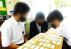カードを使って神経衰弱のようなゲームを行った。2色のカードを用意し,ピンク色のカードには接続詞(if, because, whenなど)の節を,水色のカードには,主節を記載した。三人グループを作り,二人はプレーヤー,一人は審判とし,時間を区切りながら役割をローテーションする。プレーヤーはカードをそれぞれ1枚ずつめくり,接続詞を使った文を言い,その文の意味も言う。審判はそれらを聞いて英文の正しさと意味の解釈の正誤を判定するというルールで行った。接続詞を使って文を書くことに苦手意識を持っている多くの生徒がゲームを通して復習したことで,意味を理解しながら接続詞を使った文を言うことができた。
