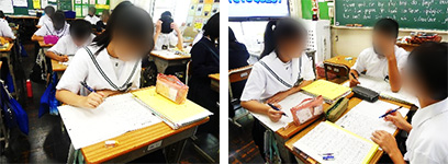 TOYO QUEST終盤の原稿を書く際には,INDIVIDUAL TIME(個別時間)とCOLLABORATION TIME(協働時間)に時間を区切った。INDIVIDUAL TIME(個別時間)には,各QUESTにおいて復習した文法や表現を使い,自力で英文を書く活動を行った。英語を苦手とする生徒も,ゲーム内で活用したカードやワークシートを利用して自力で書くことができた。COLLABORATION TIME(協働時間)には,グループを作り,自分が書いた文の正しさを実感したり,間違いを修正しあったり,自分の言いたいことと相手の解釈に差異がないかを確認したりするやり取りが見られた。これらの時間を設けたことで,生徒たちは個別に考えた英文をもとに正しい英文かどうかを確認したり,誤っている英文を一緒に直したりして,正しい英文を書くことができるようになったと感じた。