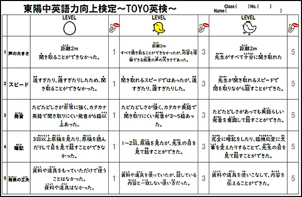 コミュニケーション活動の前には,「東陽中英語力向上検定(以下,東陽英検)」を行う。より相手に伝わりやすいように「話すスピード」「声の大きさ」「アイコンタクト」「英語らしい発音」「資料の活用」の基本的な五つの観点を意識して,ALTの代わりにJTE(日本人英語教師)に向けて発表を行う活動である。一度,コミュニケーション活動の前に実践をし,評価を受けることで,自分の活動を客観的に振り返ることができると考えた。この東陽英検を通して,「1回目よりも2回目は資料を使いこなしながら,目を見て話せるようにしたいな」やJTEの評価を見て「もっとゆっくり話して,カタカナ英語をより英語らしい発音に直せるようにしたいな」などと,主体的にコミュニケーションをとろうとする姿が見られた。