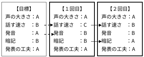 生徒は資料4のように目標設定し,繰り返し練習をして,何度も東陽英検を受検する意欲的な姿を見せた。1回目の受検では,目標と比較して,話す速さや発音に課題があるとわかり,繰り返し練習をする姿が見られた。2回目の受検では話す速さが目標に達した。さらに,暗記してアイコンタクトすることは目標を超える評価を得ることができた。