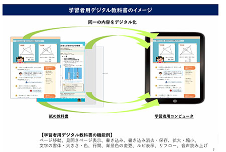 デジタル教科書には,教科書紙面だけでなく後述する「解答」機能や,「映像解説」機能,ルビふり機能など,様々な機能が搭載されている。これは,デジタル教科書推進WGの参考資料にも掲載されており,紙の教科書ではできない機能が多数組み込まれている。