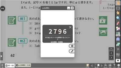 本実践では,学習者用デジタル教科書の各問題にある「解答」機能を利用する。この機能を選択すると「こたえパスワード」を求められる(図2)ため,授業者は指導者用デジタル教科書からパスワードを表示し,大型提示装置や板書等で生徒に示す。(図3・図4)一時的に見せたい場合は,大型提示装置を用いるが,通常は前述の(1)と近い運用を想定しているため,答えパスワードを板書していつでも生徒が解答を確認できるようにしている。