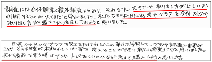 授業の最後の振り返りでは,本時の学習に対して,結果を見るのではなく,その調査の標本の取り出し方や大きさが正しいか判断する必要があることを実感した記述がみられた【資料10】。そして,これまでの学習を通して,日常生活で同じようにデータを読み取る場面があったら,調査方法が正しいか考えた上で,判断していきたいというように,学びを生活に生かそうとする記述がみられた。
