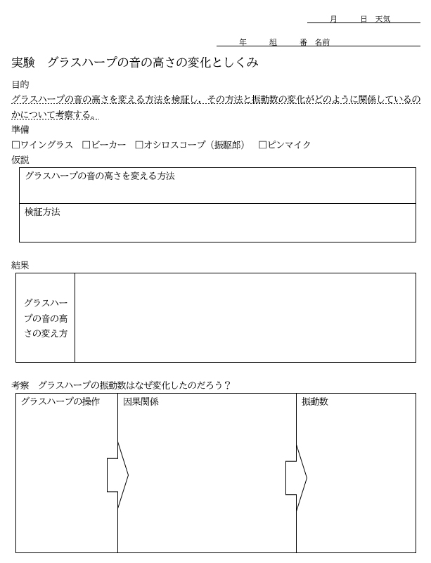 また,「音」という現象が日々の生活の中で非常に身近なものであるがゆえに,その性質や特徴について深く考える機会は必ずしも多いとは言えない。『振動数が増加すると音は高くなる』『振動数が減少すると音は低くなる』ということを,知識として暗記することに留まる生徒が多く,振動と音を関係づけて捉え,日常の音による現象に当てはめて考えられるように理解することに難しさがあると感じる。音の現象についての科学的な認識を深めていくことは,日常生活をより豊かなものにするためにも重要である。 そこで,発音体として『グラスハープ』を題材とした探究的な学習を行うことで,音による現象を生徒が本質的に理解できると考えた。また,目に見えない自然の現象でも,協働的に学習を進めながら様々な試行錯誤を経て検証することで理解できるという実感を生徒が抱き,生徒の更なる探究的な学習の充実につなげることができると考え,実践した。