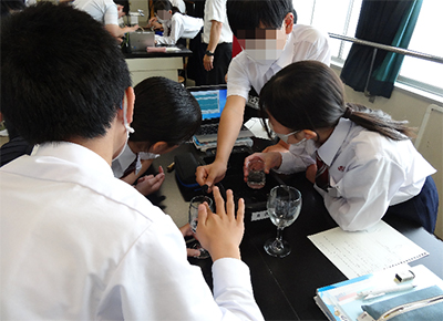 この授業の前時段階で生徒は,「音の大きさは振幅が,音の高さは振動数が関係している」ことをすでに学習している。したがってこの時間は,「グラスに行った操作(水量,グラスの大きさの変化)」という原因と,「振動数が変化した」という結果の間にある因果関係について,既習事項や今までの経験などを活用して探究することをねらいとしている。(以下,公開授業の様子)