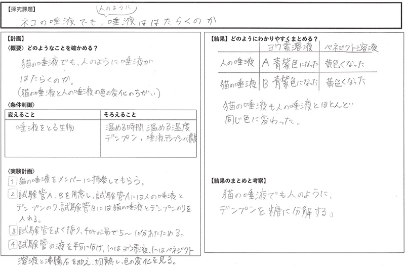 - ○教科書と同じ条件で実験したが,デンプンがなくなるはずの試験管でヨウ素溶液が反応した。自分たちの班だけ他の班と結果が違ったので,唾液を綿棒に含ませる量が少なかったのかもしれない。ベネジクト溶液も黄色になって反応していたので,デンプンは一部糖に変わったが,分解しきれずに残ったデンプンがあったのかもしれない。
