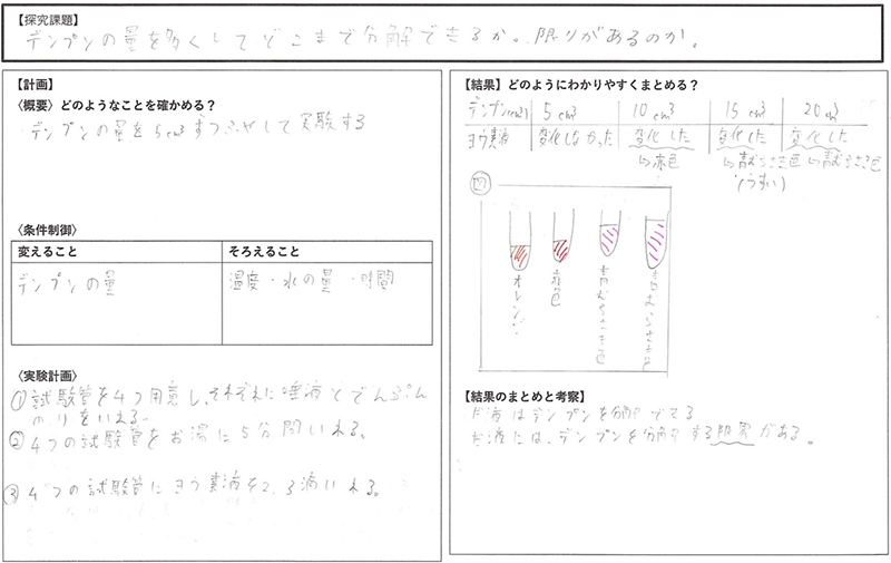 班ごとに考察を行った後,学級内で交流した。同じような条件で実験を行った複数の班の結果が異っていたり,教科書と同じ条件で行った実験が教科書に記載されている結果と大きく異なっていたりした班が,結果をどのように解釈して結論としてまとめるかがポイントとなった。また,振返りをした際に条件制御が適切でないことに気付いたり,新たな疑問が生まれたりした班もあった。