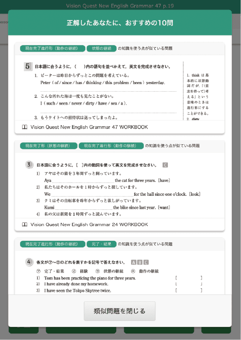 解いた問題と同じ知識を使う問題や,解き方が近い問題を,Libry内で持っている書籍から横断して表示します。