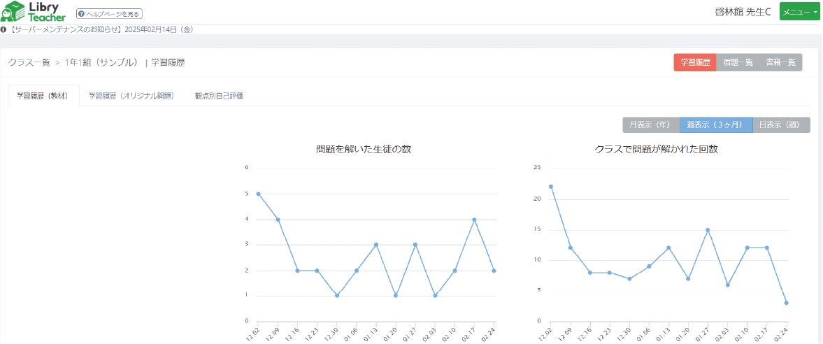 クラス全体の学習の取り組み状況をグラフで表示したり,個人の自主学習の取り組み状況を表示することも可能です。