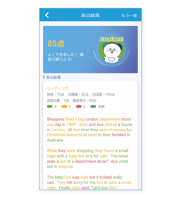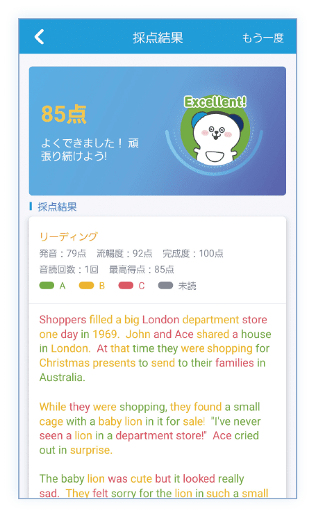 「発音」「流暢度」「完成度」の観点で採点。どの単語が苦手か,一目でわかります。
