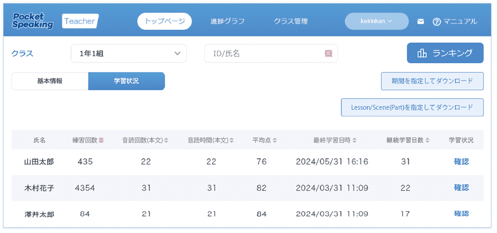 生徒が取り組んだ時間,回数,点数を確認することができます。