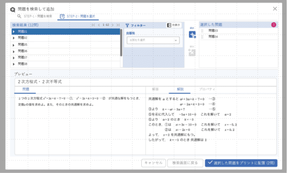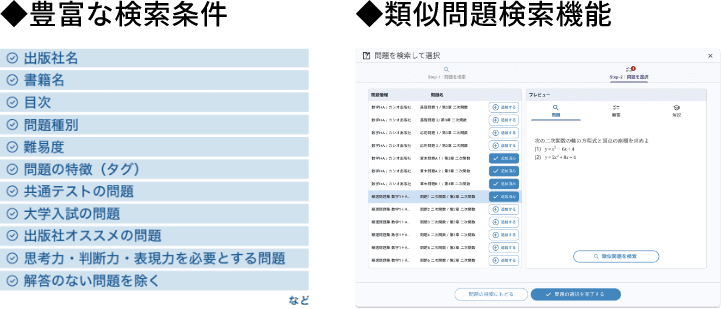 啓林館が発刊する教科書・教材に掲載されている問題のほか,Q.Bankと提携する出版社が発行する教科書・問題集・参考書などに掲載されている大量の問題をデータベースに収録します。問題数は9万問以上※(2025年9月時点での予定)。先生はそれらの問題を,出版社を横断して検索し,編集することが可能です。
