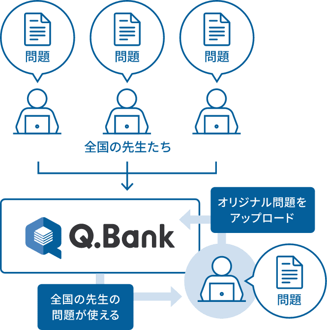 問題シェア機能によって,オリジナルで作成した問題やプリントを全国の先生と共有することが可能です。各先生が自身で作成した問題をアップロードすることができ,問題作成者がシェアした問題は他の先生が利用することができます。