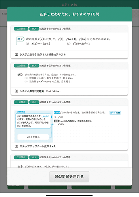 解いた問題と同じ知識を使う問題や,解き方が近い問題を,Libry内で持っている書籍から横断して表示します。