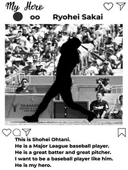 なお、今回の実践では、私が作成したワークシート(写真1)を最後に作成して、発表することをゴールとしたため、教科書の動画でUnit5のテーマが「My hero」についてであることを確認したのち、私が子どもたちの前で、ワークシートを提示しながら実際に発表のお手本を示した。