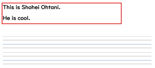 STEP 3では、既習事項や調べたことを活用し、「自分ごと」を英語で表現する活動を行う。子どもたちの個性や興味が反映される場面であり、英語を使って「伝えたい」という意欲を引き出すことができる。ただしその単元で身に付けさせたいKey sentenceの型は崩さないことなどの指定はしつつも基本的には子どもたちが表現したい内容を英文で書かせる。得意な子は自分の持っている知識で書くことができ、苦手な子はタブレット端末などを使うことを許可し、自分なりに英文を書いていく。