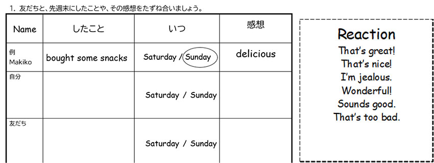 | 2 | 仲間と夏休みについてたずね合う活動を通して,自分のしたことやその感想を答えたり,相手の話している内容を理解したりすることができる。 |