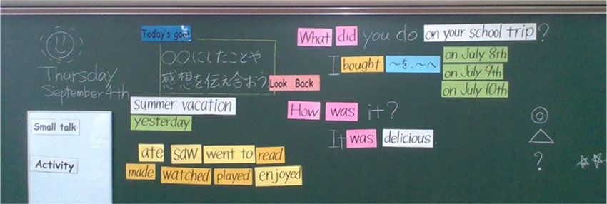 児童の中には,I enjoyed on Monday.のように目的語のない文を話すことがある。そうした間違いに気付くには,このような視覚的な支援は有効だと思う。