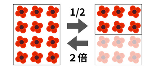 乗法及び除法の見方は,本単元でいえば分ける前の元の大きさから1つ分を捉えるか,分けた1つ分から分ける前の元の大きさを捉えるかの違いである。例えば,「12個の1/2は,6個」という全体から部分への見方ができる。また,「6個の2倍は,12個」という部分から全体への見方もできる。前者は除法の見方,後者は乗法の見方と捉えられるだろう。(図1参照)