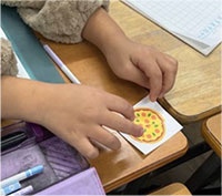 4時間目は,1時間目の導入で扱った1/3の大きさのピザから学習を始めた。4時間目になると,何人かの児童が「1/3」と予想を言ったり,確かめるために3切れあれば確かめられる旨の発言をしたりしていた。何切れで1枚になりそうなのかを問いかけると,多くの児童が3枚必要とつぶやいていた。そこで,4人班になり,1人1切れずつのピザの絵を配付した。すると,途中で「元々のピザも欲しい!」という声が聞こえたため,分ける前の1枚のピザの絵も配付した。児童たちは最初もらった一切れを班で出し合って,1枚のピザの上に3切れ乗せ,「めっちゃピッタリになる!」と3切れで1枚分になることを確かめていた。(写真3参照)