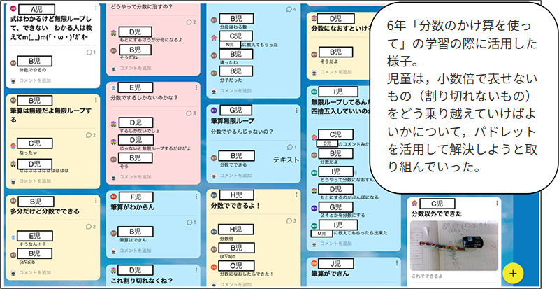 教師側はB児が抱いたような問いをつい軽視して進めてしまうところを,パドレットを用いることで問いとして共有することができた。そしてB児の問いに対し,C児が反応し,A児の同意や,D児の補足によってB児のわからなさが教師の介入なく解決されていた。