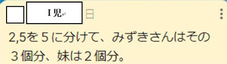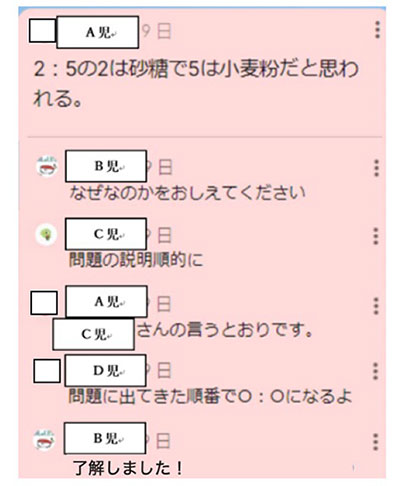 この問題を提示すると,A児から左記のようなアドバイスの書き込みが見られ,それに対してB児からは問いの書き込みが見られた。問題の出てくる順序で比は表されるという確認をしないまま授業を展開していく中でB児は比の数値が何を示すかという「わからなさ」をパドレットを通じて表現した。