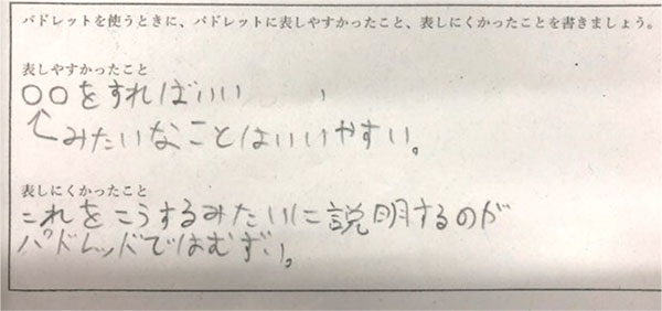 なお,突然このようなアドバイスを行った理由をA児に問うたところ,「近くの席でこの2という数は何なのかといった発言が聞こえたから。」とのことであった。A児は授業後,パドレット活用についての振り返りで次のように記述している。