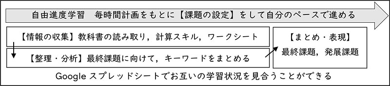 「学習の手引き」を見て一人で学習を進めていくには限界があると考える。子供同士の協働を促すきっかけづくりとして,Googleスプレッドシートなどの共同編集ツールを使い,お互いが取り組んでいる課題や学習状況をいつでも知ることが出来る環境を提供していく。これにより,目標達成に向けた協働的な学びを促していく。
