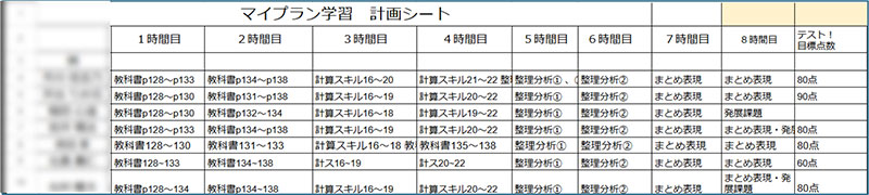 本単元の1時間目に,以下で示したようなマイプラン学習計画シートを使い,子供がGoogleスプレッドシート上に共同編集で記入した。自分だけでは計画が立てられない子供は友だちの計画を見ながら,進めるペースを考えて記入する姿があった。