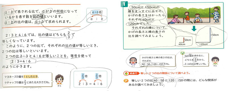 この活動を通して,子供達は「比」や「比の値」の意味の理解を深めた。特に「比の値」を理解するためには「a:b」で表される比があった時に「aがbの何倍になっているか」という割合の視点が必要であるので,文章だけでなく教科書に書いてある図を読み解くこの活動は,教科の内容理解や最終課題達成に向けて有効であったと考えられる。