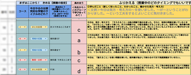 毎時間Googleスプレッドシートを使って,リアルタイムでお互いの学習の状況を知ることができるようにした。子供達はタブレットで,以下に示したような画面を見ながら学習を進めていた。