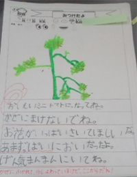 ○ミニトマトを植えて,名前をつけることができる。 ・苗を植える際,土や根をほぐして優しく植えよう。 ○諸感覚を使い,父母になったつもりで観察をすることができる。(1回目) ・諸感覚,お父さん,お母さんになったつもりでカードを書こう。 |