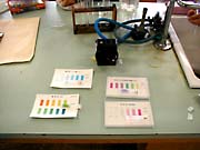| 2) | 0.1%の水酸化ナトリウムを5ml入れてかき混ぜる(弱アルカリ性にした方が,あとの吸着がうまくいく)。 |