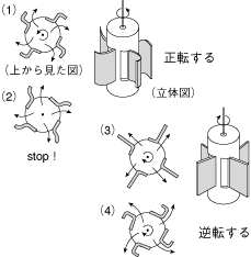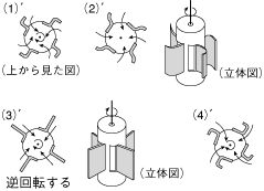 (3)羽根を垂直にすると,圧力差の寄与の方が大きくなり,右回り(逆回転)するようになる.「吹き出し」でも逆回転することに注意.びっくりする現象であろう.