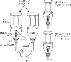 さて,最後にファインマンがやってできなかった水中でのタービンの回転にチャレンジしてみた.原理は,超小型「目薬型ファインマンタービン」をペットボトルの中に入れて,連通管の仕組みでタービンの水を出し入れするだけの簡単なものである.回転をスムースにするために,目薬のポリ容器の上部にビーズを入れるとよい.これで,ファインマンが果たせなかった実験が完成し,その結果,彼の予想をくつがえす見事な逆回転が見られたのである.