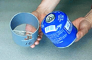 1時間目の「等速直線運動と力」は演示を中心とした討論の授業である.エアートラックの運動を見せたり,力学台車に外力を加えたときの運動を予測させるなどして,等速度運動をしている物体には外力が働いていないことに気づかせる.授業の最後にはエアーパックを滑走させ,物体に動き続けようとする慣性があることを体験させる.写真は筆者が自作したエアーパックである.使い終わった携帯コンロ用のガス缶に空気を圧入して滑走させる.2時間目は,台車を一定の力で引く生徒実験である.