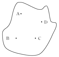 図のように、町に小学校 A,B,C,D がある。生徒は、自分の住所に一番近い学校に通学するものとして、A,B,C,D 校の通学区を図に記入せよ。
