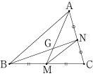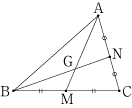右の図のように,△ABC があり,2辺 BC,CA の中点をそれぞれ M,N とする。また,2つの線分 AM と BN の交点を G とするとき点 G は線分 AM を 2:1 に内分することを示せ。