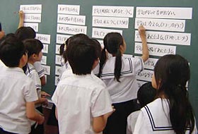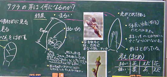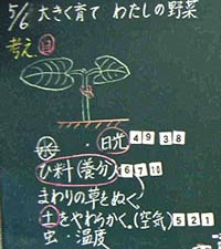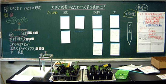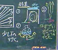 | 5年「植物の発芽と成長」 ↑クラスで一番よい班の方法を,大きな紙の中にかき,全員で検討する。 |