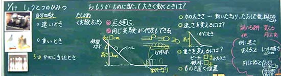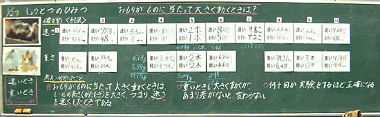 | 5年「おもりがあたったとき」 ↑各グループの結果を縦に 見たり,横に見たりして,比較しながら考える。 |