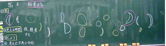 4年「月や星」 ↑『同じ日の月を見てかいたのに,形や向きが違うよ?』 |