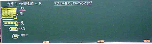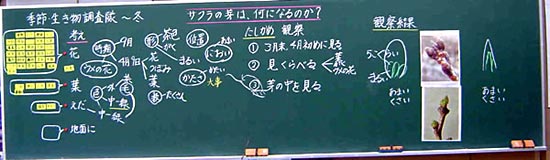 | 4年「冬のしぜん」 ↑ノートに結果がかけたグループ(子ども)から,その結果を黒板にかく。 |