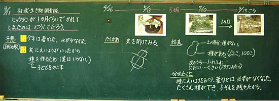 | 4年「夏のしぜん」 ↑ヒョウタンの生長写真を横に貼り,時間的変化から結果と照らし合わせて考える。 |