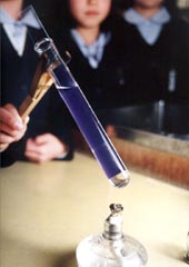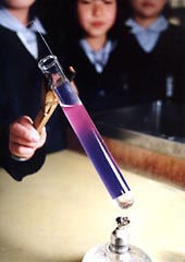 こうしてできた紫色の液が原液です。加熱すると青色に変化します。 |