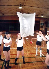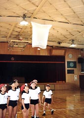 火をつけた熱気球は,天井までゆっくりあがり,火が弱くなると再びゆっくりと降りてきます。子どもたちは大喜び。しかし,以前,同様の実験を行ったときはすぐに授業どころではなくなってしまいました。というのは,天井に設置している火災報知器が反応してしまって,全館に非常ベルが鳴り響いたからです。実験するときは,火災報知器の真下でやることだけはくれぐれもさけた方がよいでしょう。