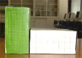 | (1) | 複雑な形(L字型)の体積の求め方を考えるところで,ビデオを使って課題を提示する。初めは,L字型を真横から見せる。そして,立体をゆっくり回転させ,次第にL字型であることを理解させる。初めに見せる形から既習の立方体や直方体の体積の求め方を確認させるだけではなく,複雑な形の体積の求め方という本時の課題をはっきりさせる。