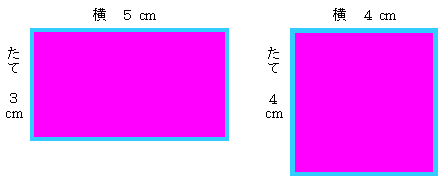 | T | 「今日は広さくらべの勉強をします。四角形のたてと横の長さが(たて3cm 横5cmの長方形)と(1辺が4cmの正方形)はどちらが広いでしょう。」 |