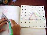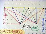 | → | ジオボードで試行錯誤させる。「面積が等しい三角形」の掲示物を参考にさせる。 |