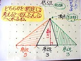| → | 面積が2倍,3倍の三角形を書いたワークシートを与え,底辺の長さと高さを測ることで,どこが変化しているか調べさせる。 |