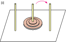 | 解説: | 3本の棒があります。そこに穴のあいた大きさの違う円盤が□枚あります。これをなるべく少ない回数で他の棒へ移動して下さい。 |